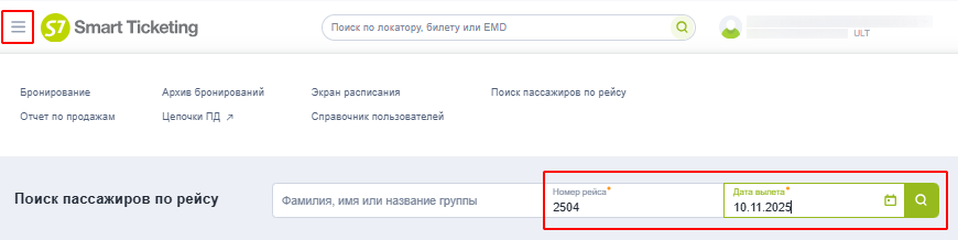 - В контекстном меню заполните обязательные поля «Номер рейса» и «Дата вылета» или выберите опцию «Поиск пассажиров по рейсу»: