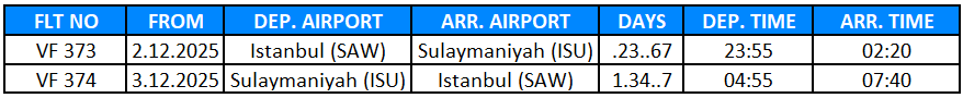 Our Istanbul-Sulaymaniyah flights, which will operate 4 times a week starting December 2, 2025, on sale with fares starting at USD 99.