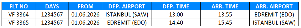 As of 1 June 2026, our Istanbul (SAW) – Edremit (EDO) flights will operate 7 times weekly and are now open for sale.